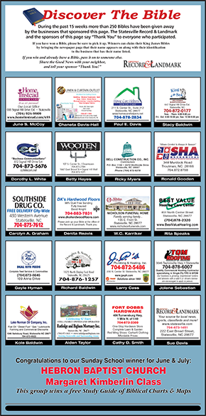 Discover the Bible™ is a product we offer customers consistent with our mission to provide faith-based products that are community and reader responsive. Businesses sponsor the page as part of a weekly Bible giveaway for readers that participate. The contest can last 13 to 17 weeks and result in hundreds of Bibles being given away in the community. We provide the contest verses and sell anywhere between 20 and 30 sponsors that want to "spread the word" about their product or service while awarding a Bible to a reader each week.